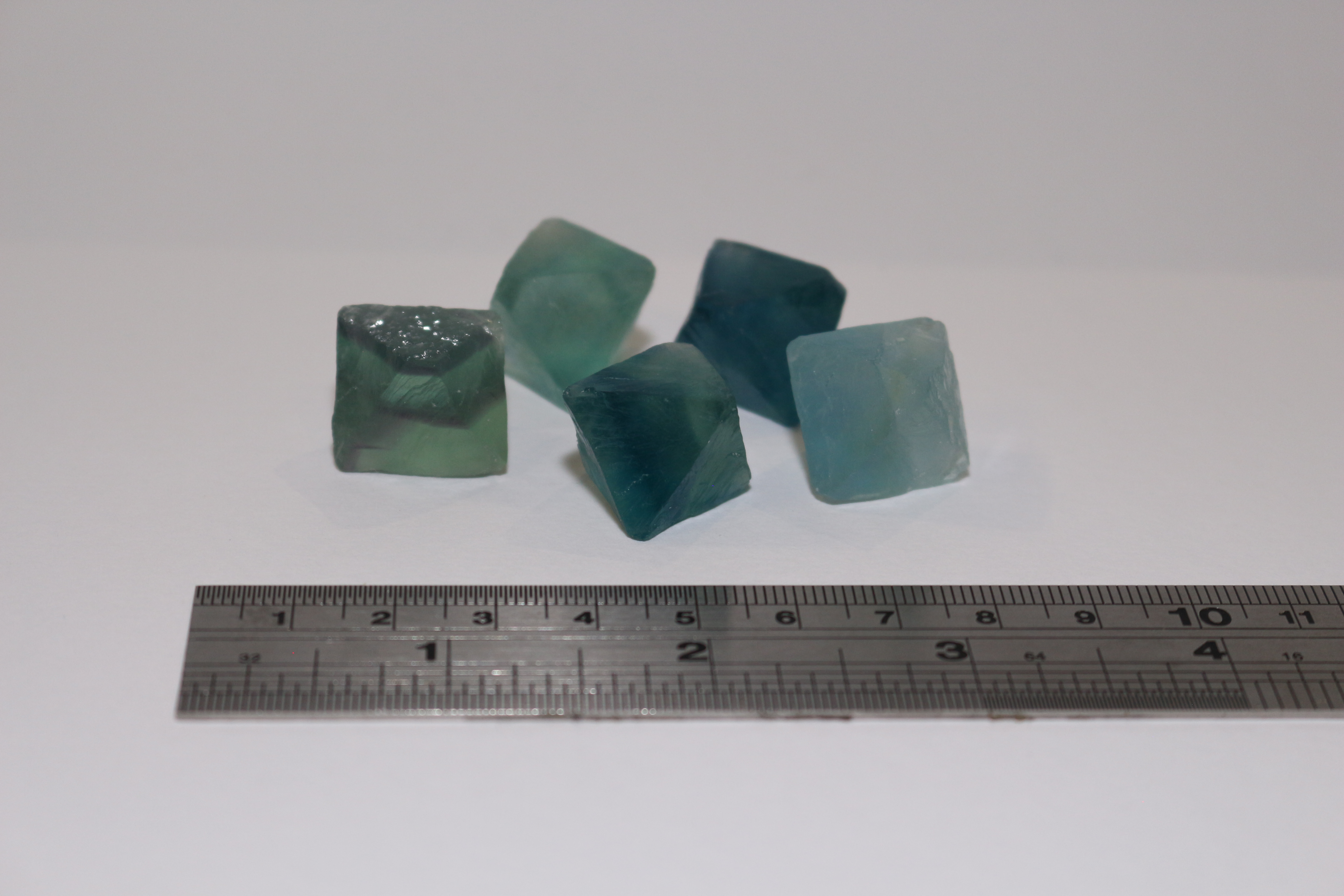 Description : Blue/green octahedral Fluorite, 2-3cm. Origin unknown. Bought in 2024, £3 each
