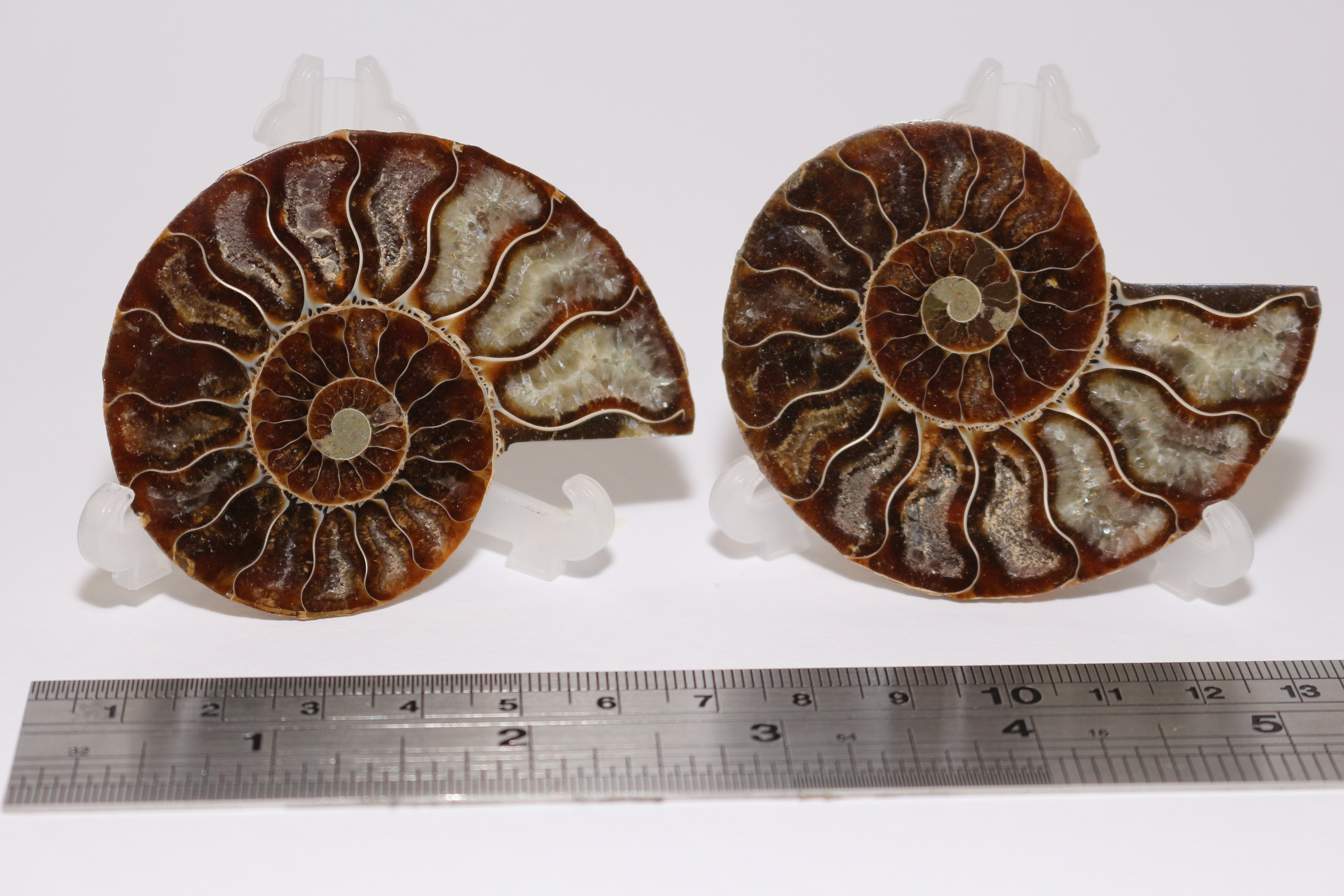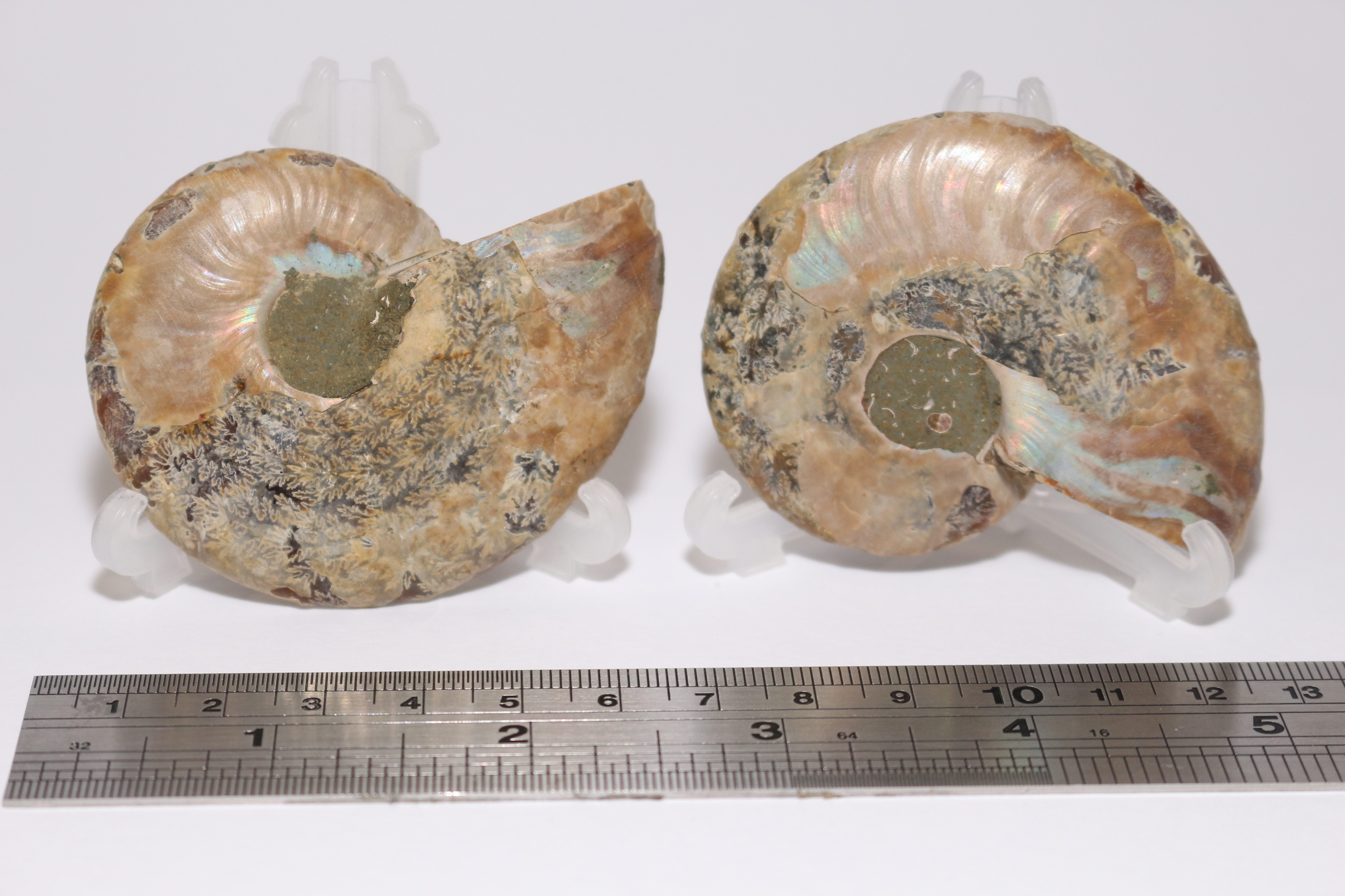 2 polished halves of polished ammonite, 6cm, quartz infill into septa. Iridescence (aragonite?) on external side.