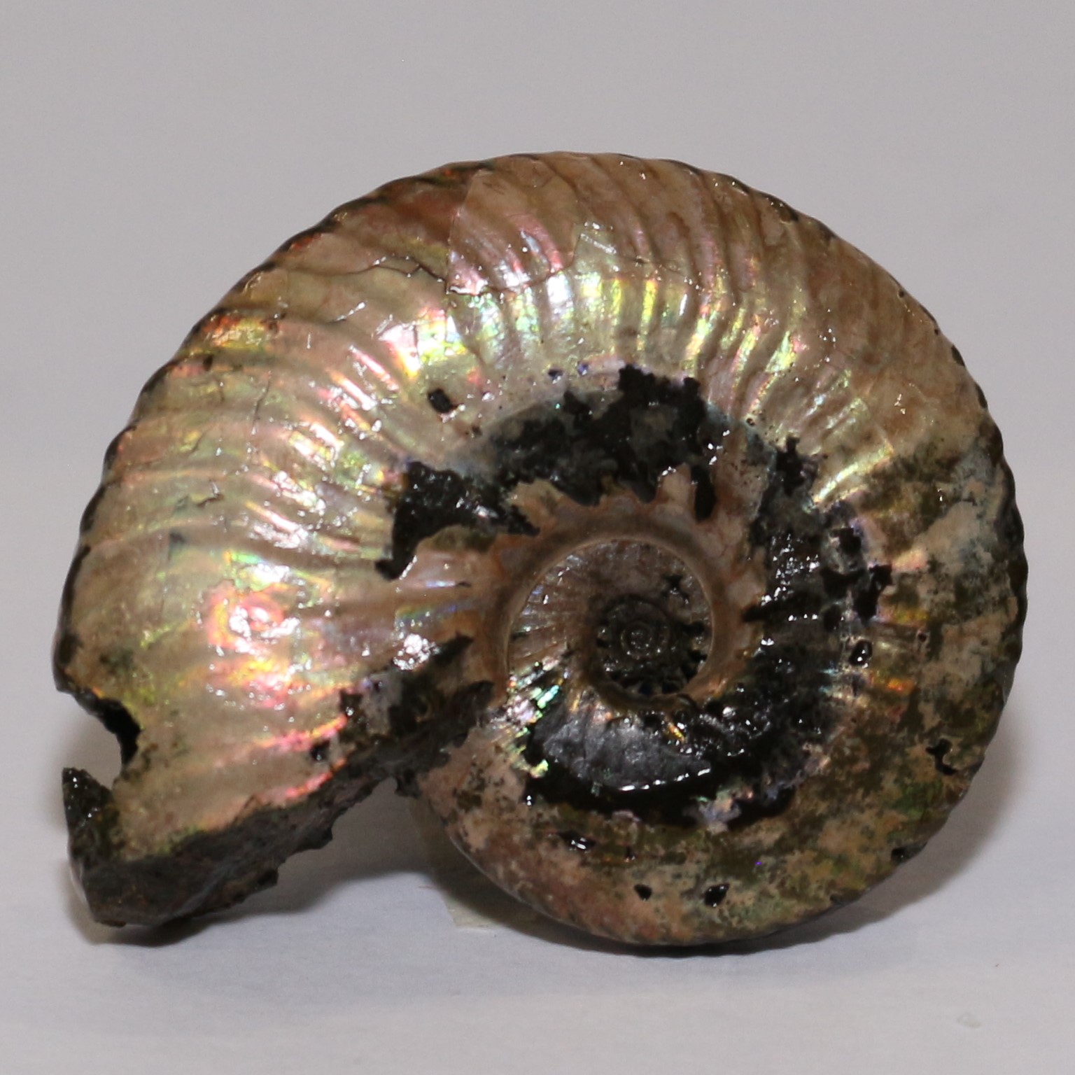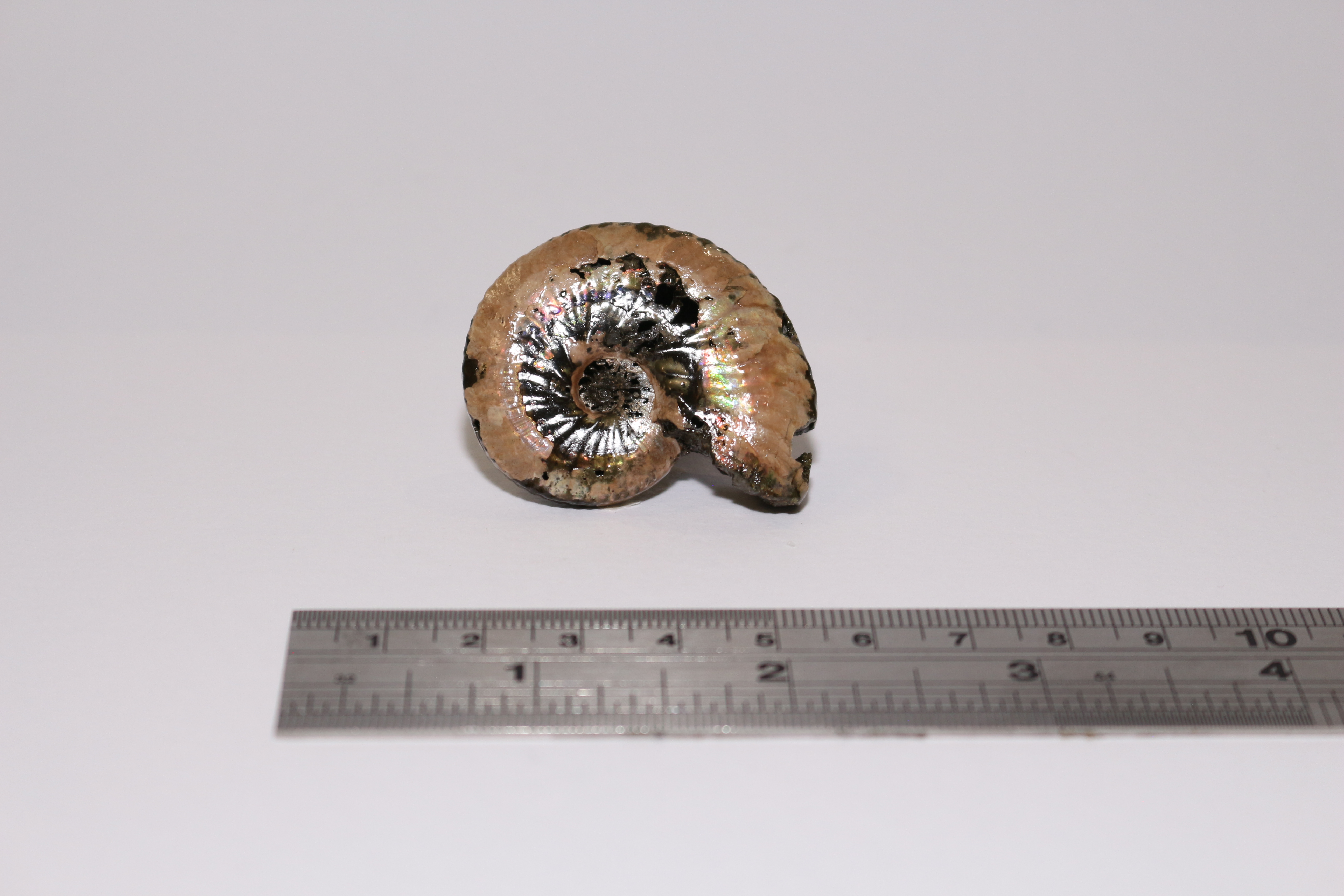 Ammonite fossil, whole, 5cm with iridescent aragonite.