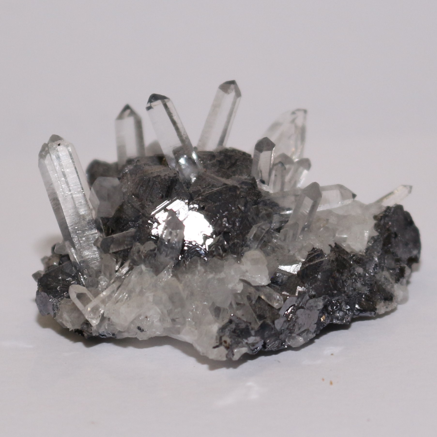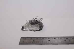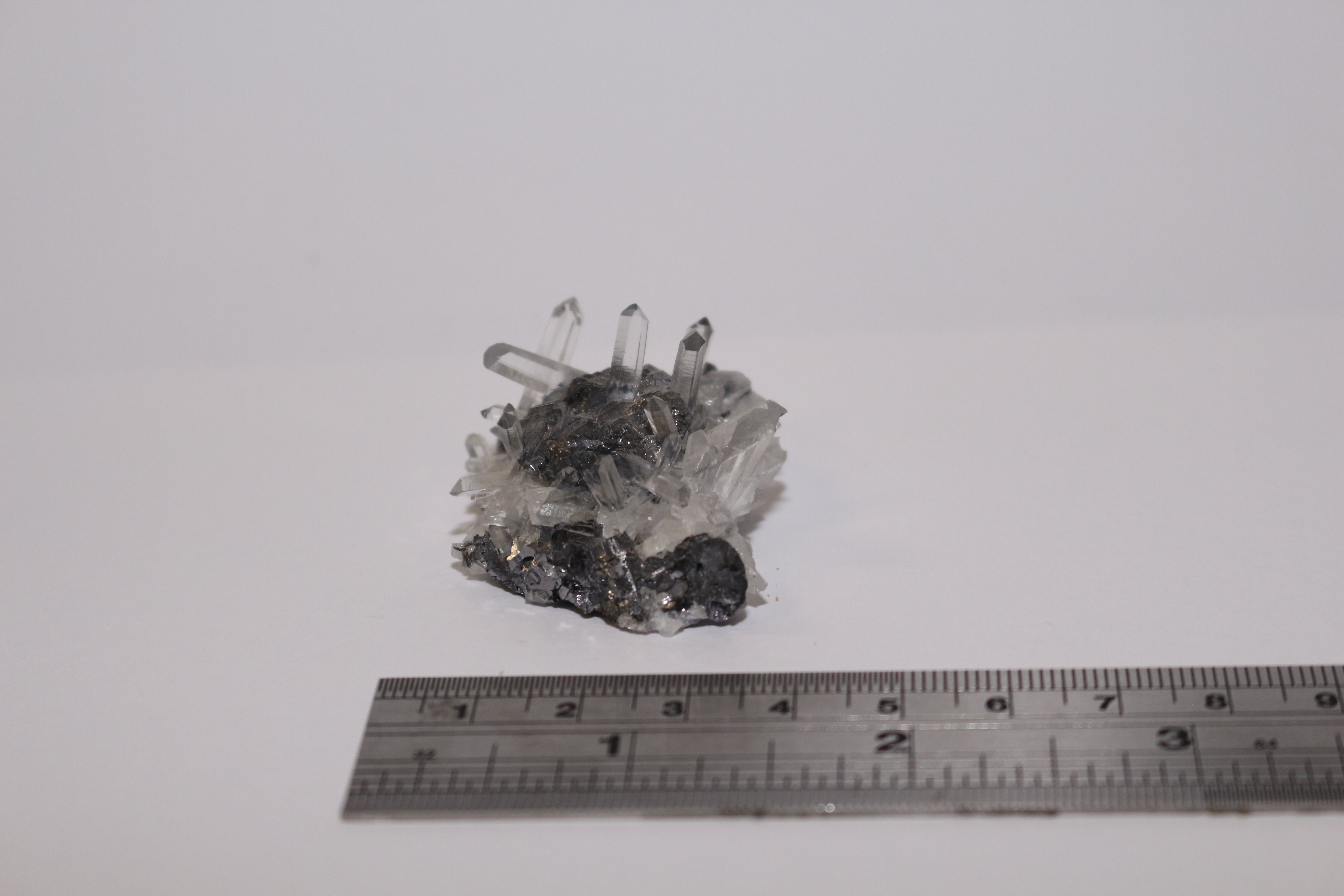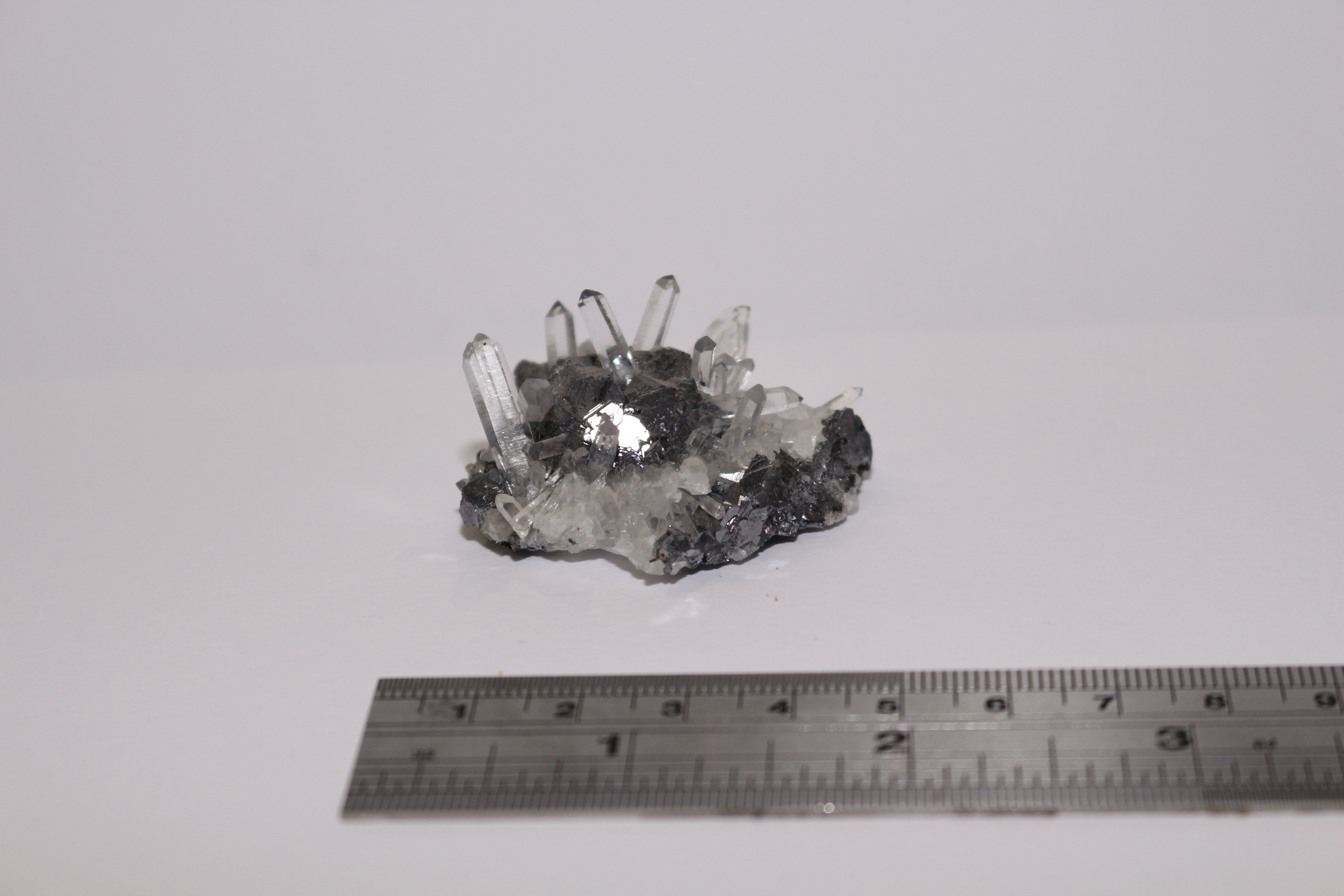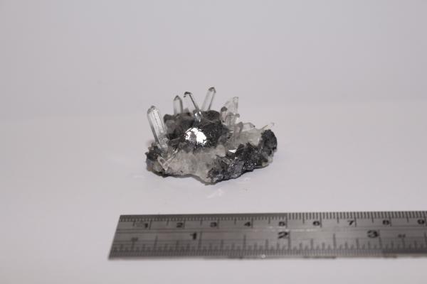 Needle quartz crystals and triangular and cubic galena crystals in a cluster. Specimen 6 x 4cm. Bought at Kempton Park from dealer specialising in minerals from Pakistan, approx 2018