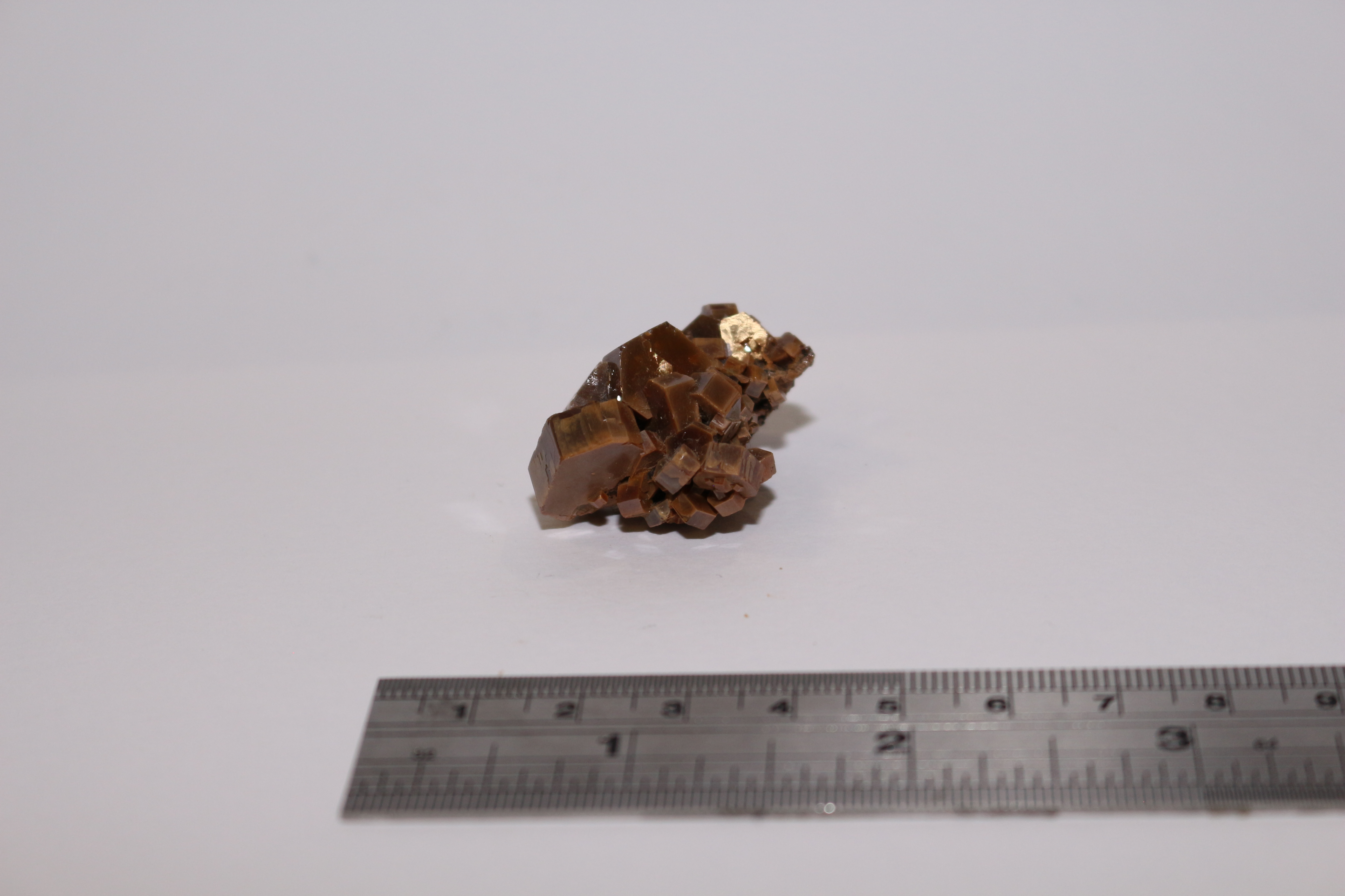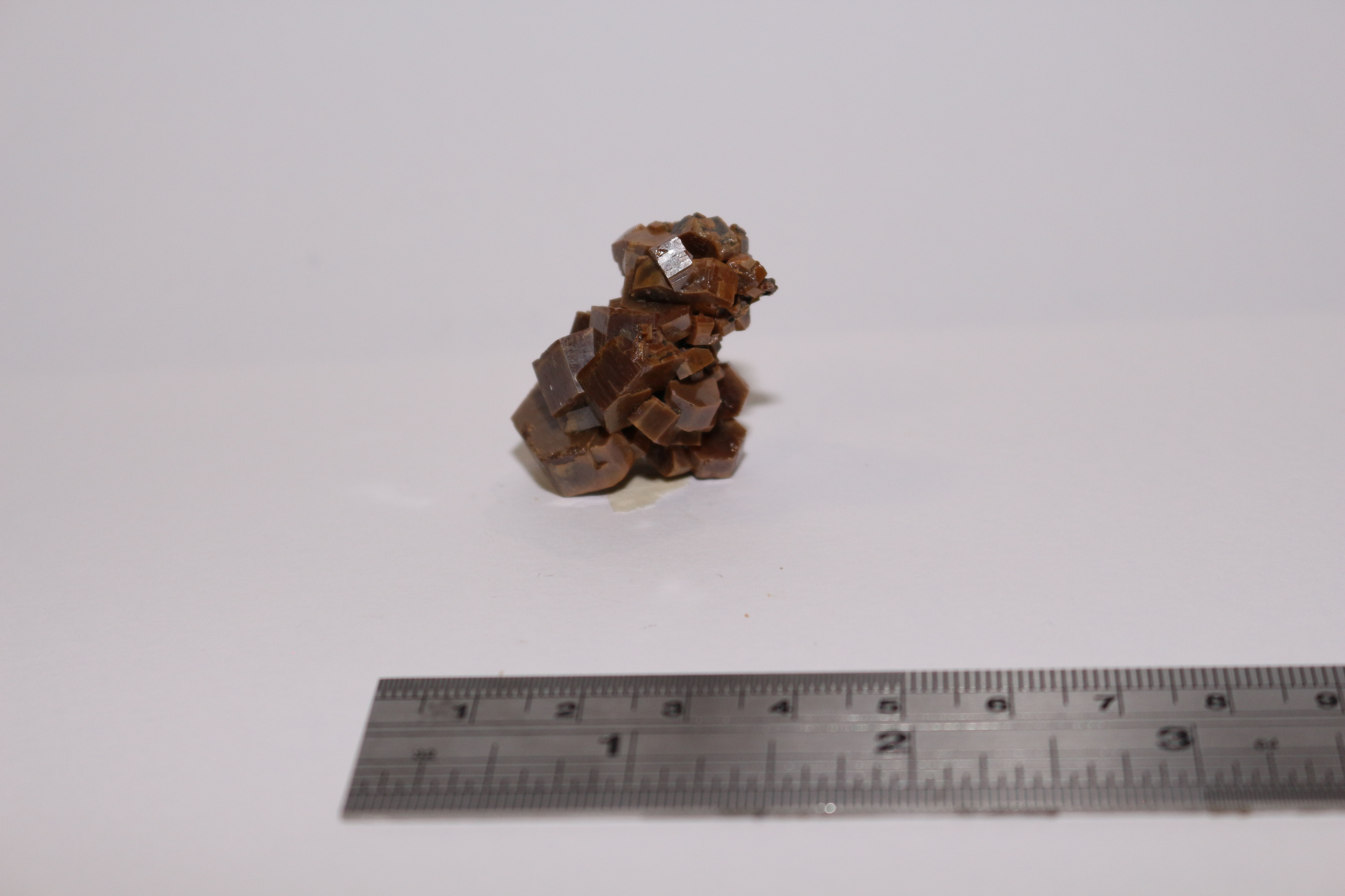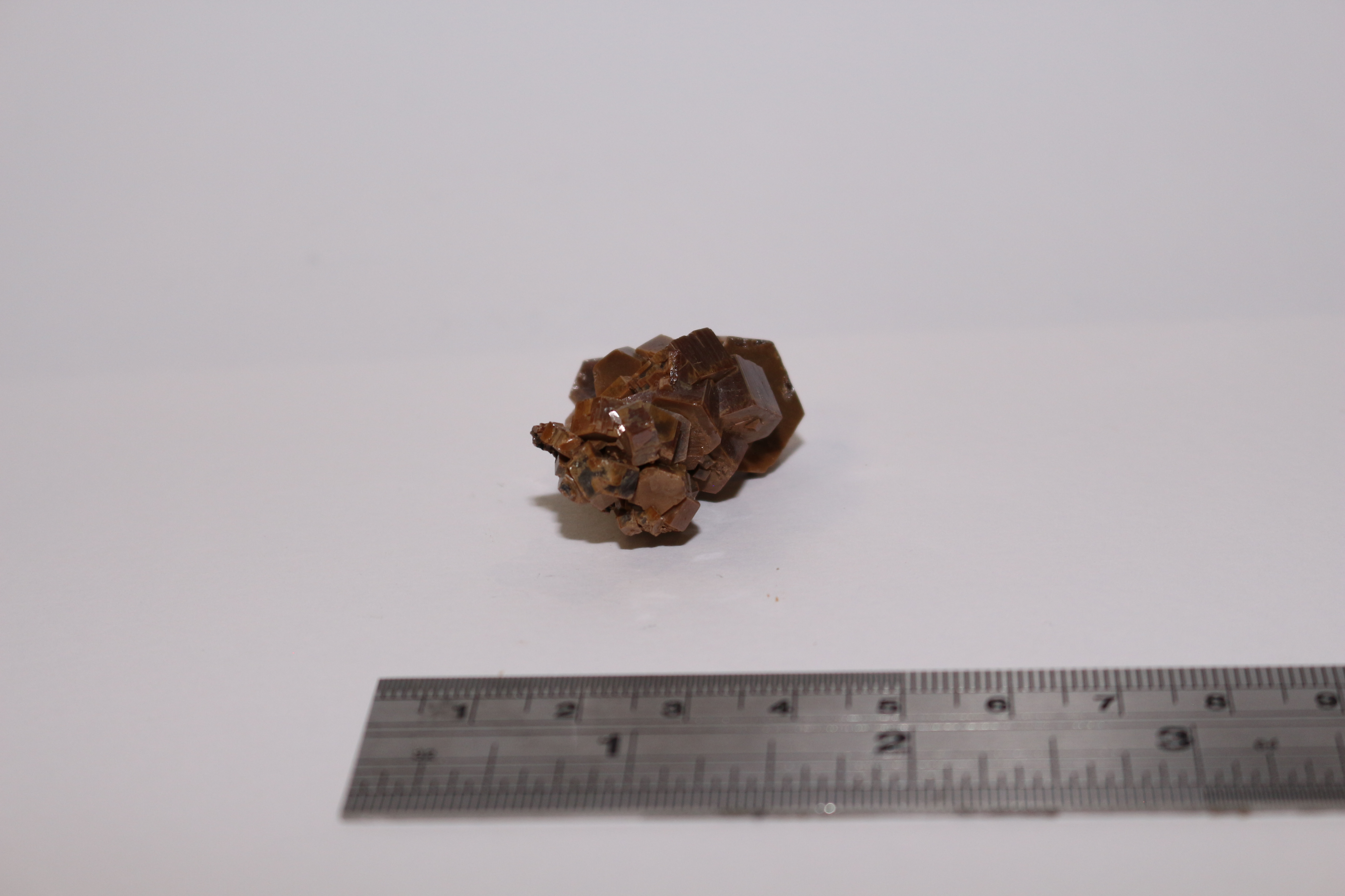 Red-brown crystals, some cubic (replacing Galena?) some hexagonal. 4cm cluster of individual crystals, each 0.2-0.7cm. Bought at Kempton Park in 2022