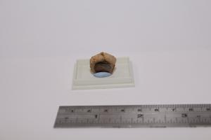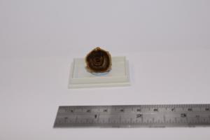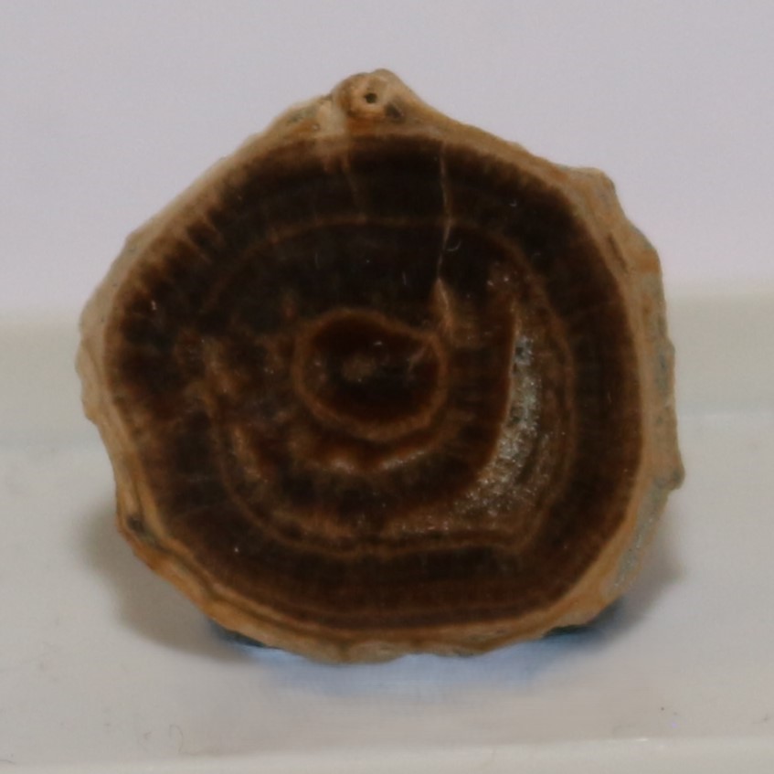 Description : Oakstone slice, 2cm diameter, browns in colour, pseudo-stalactititc.