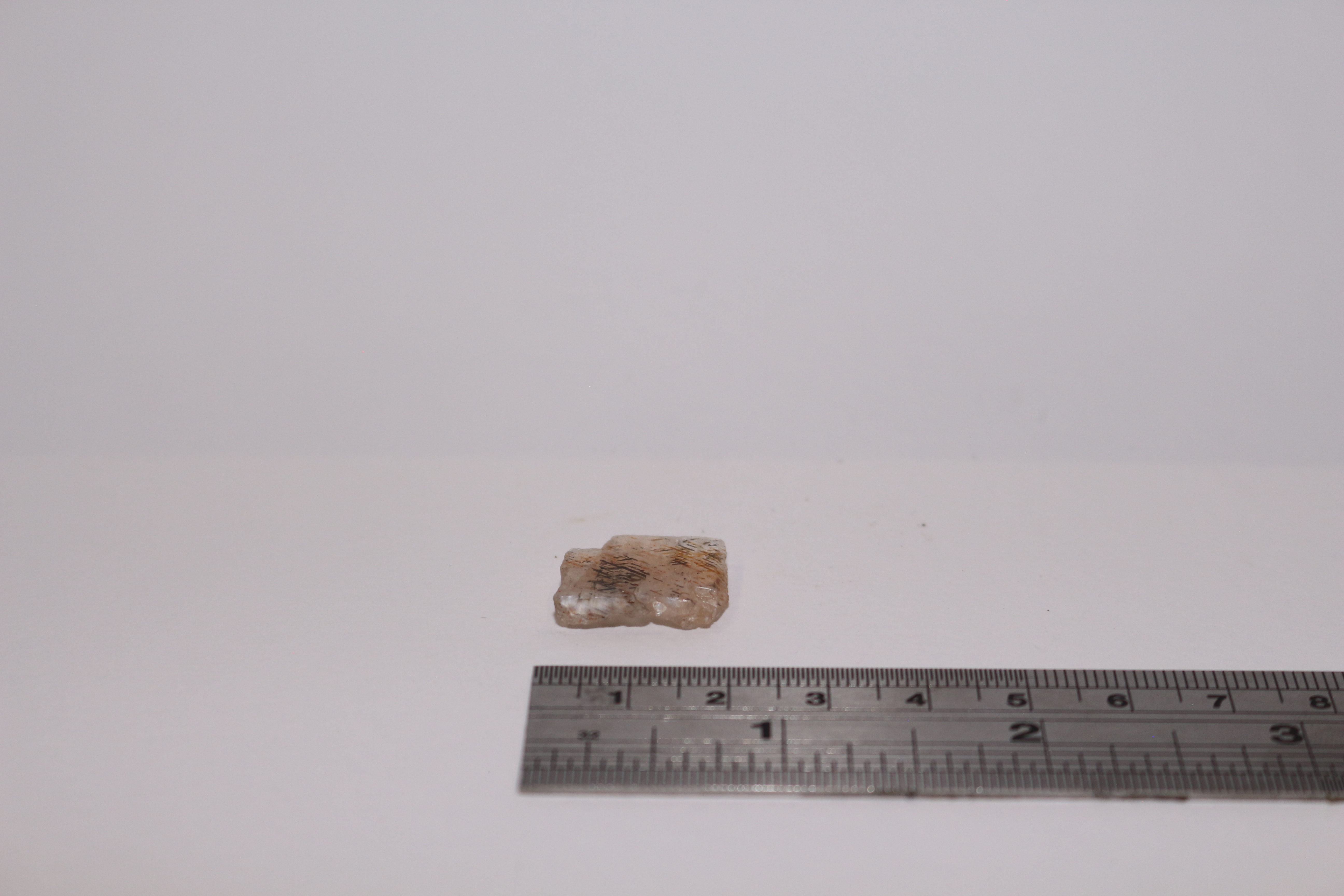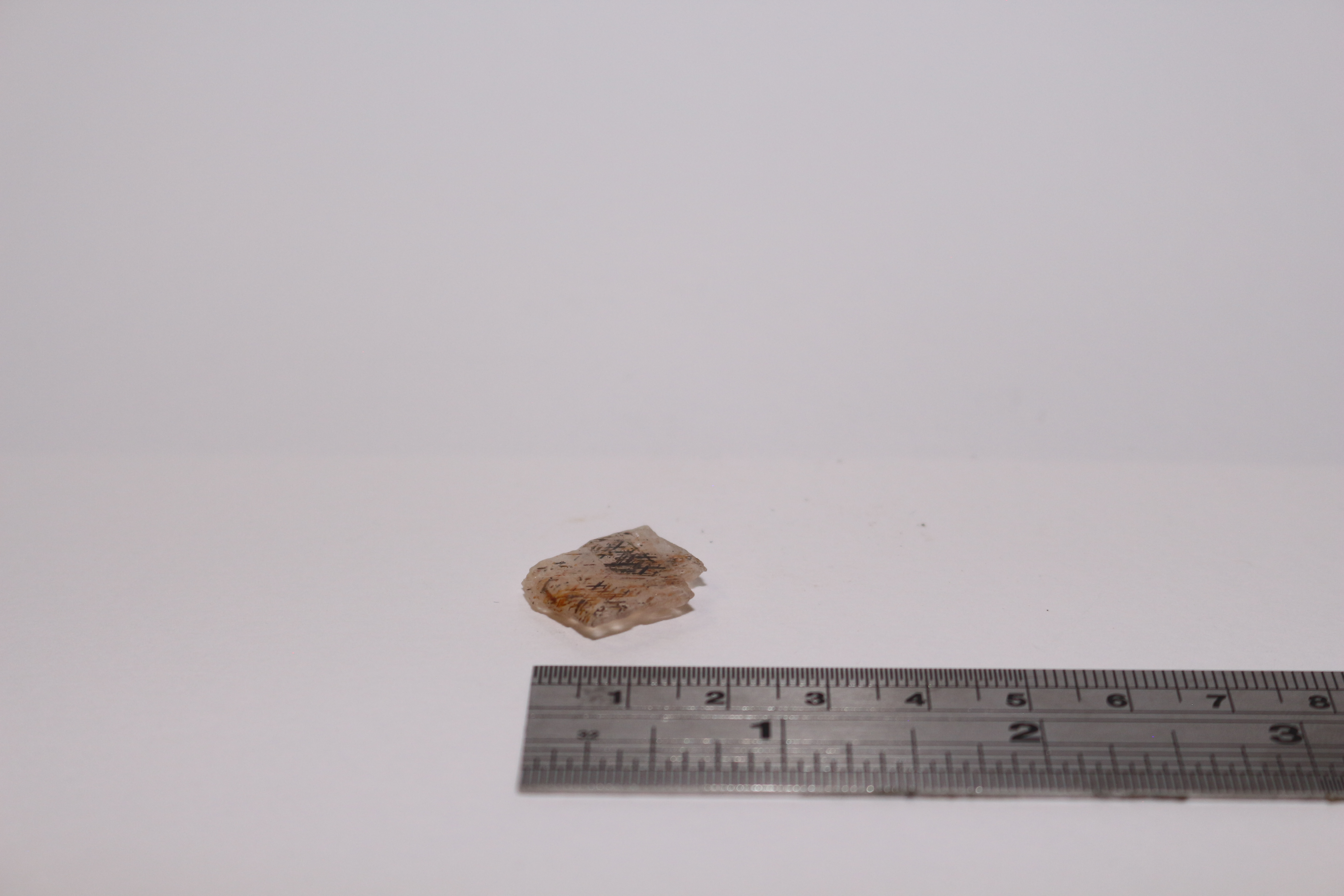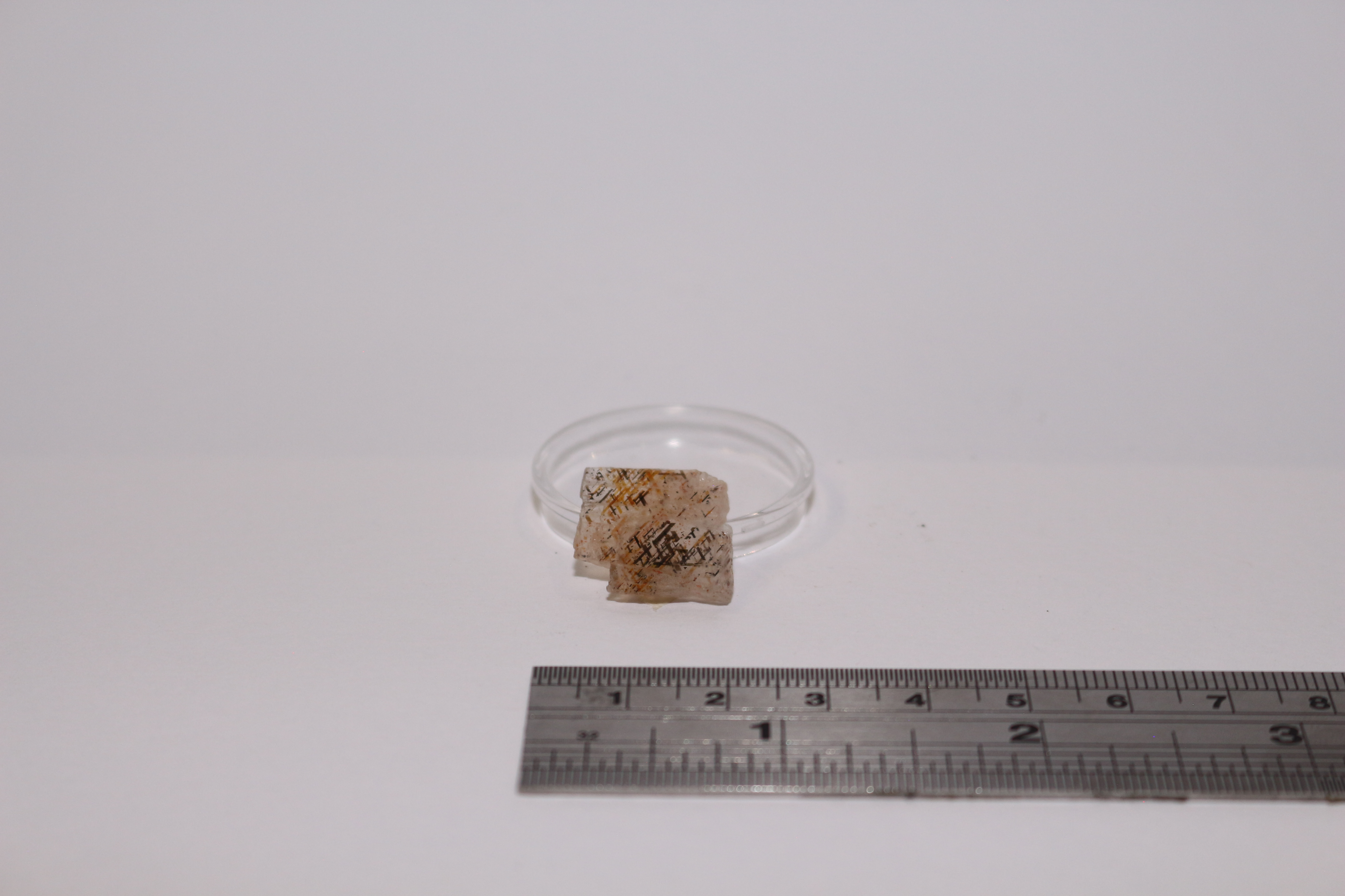 Polished specimen 2 x 2cm, ilmenite inclusions and iridescence, rare purple laths