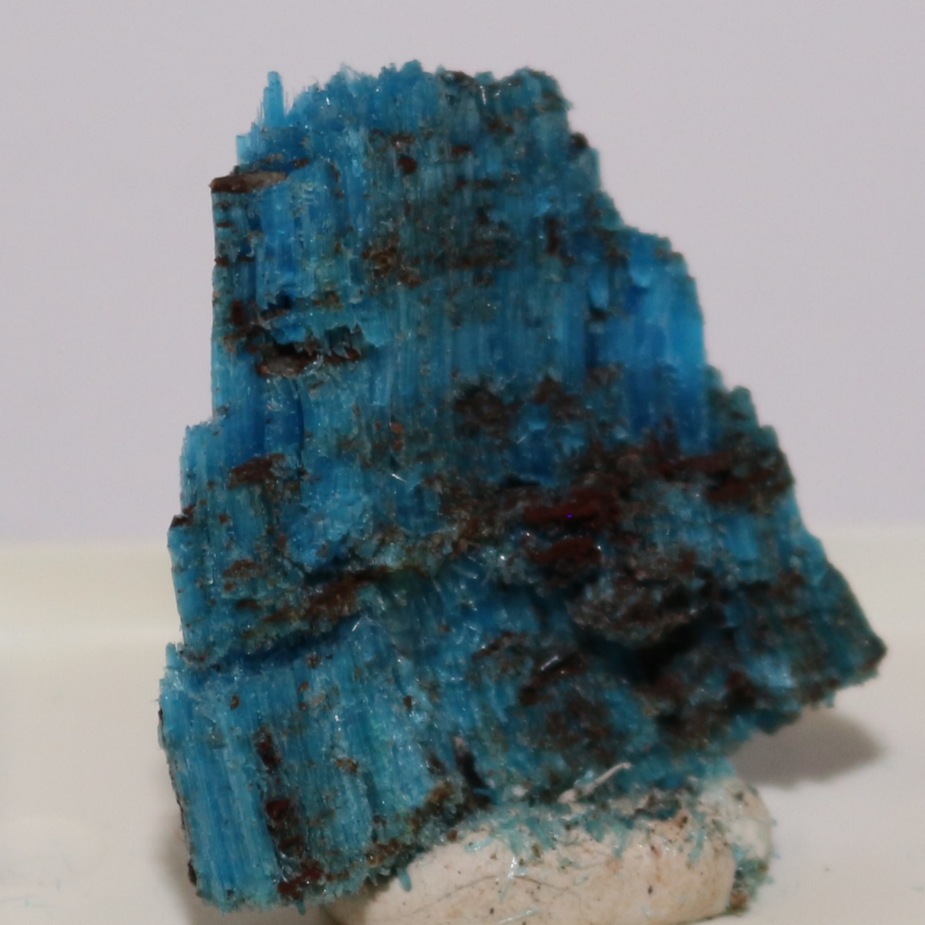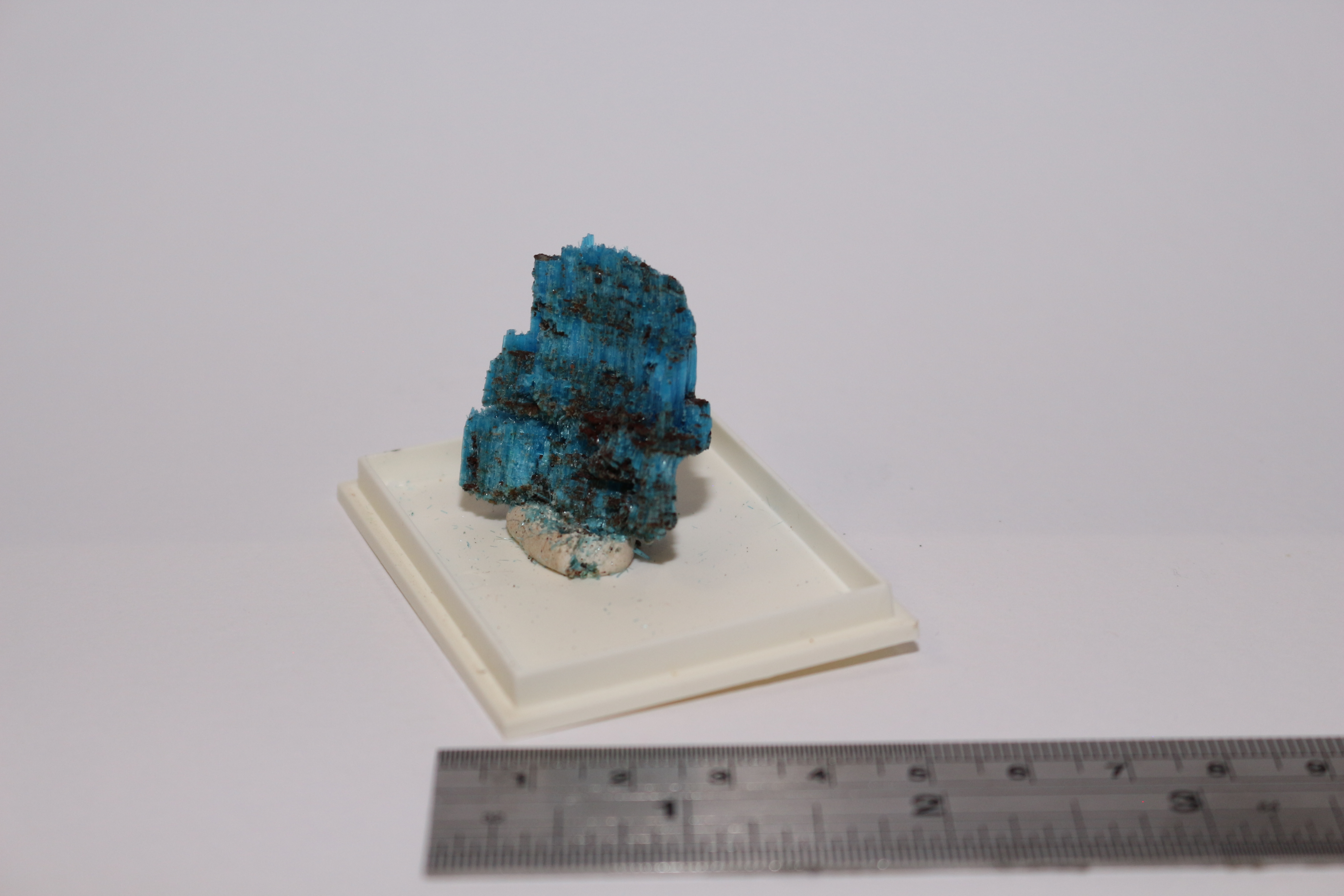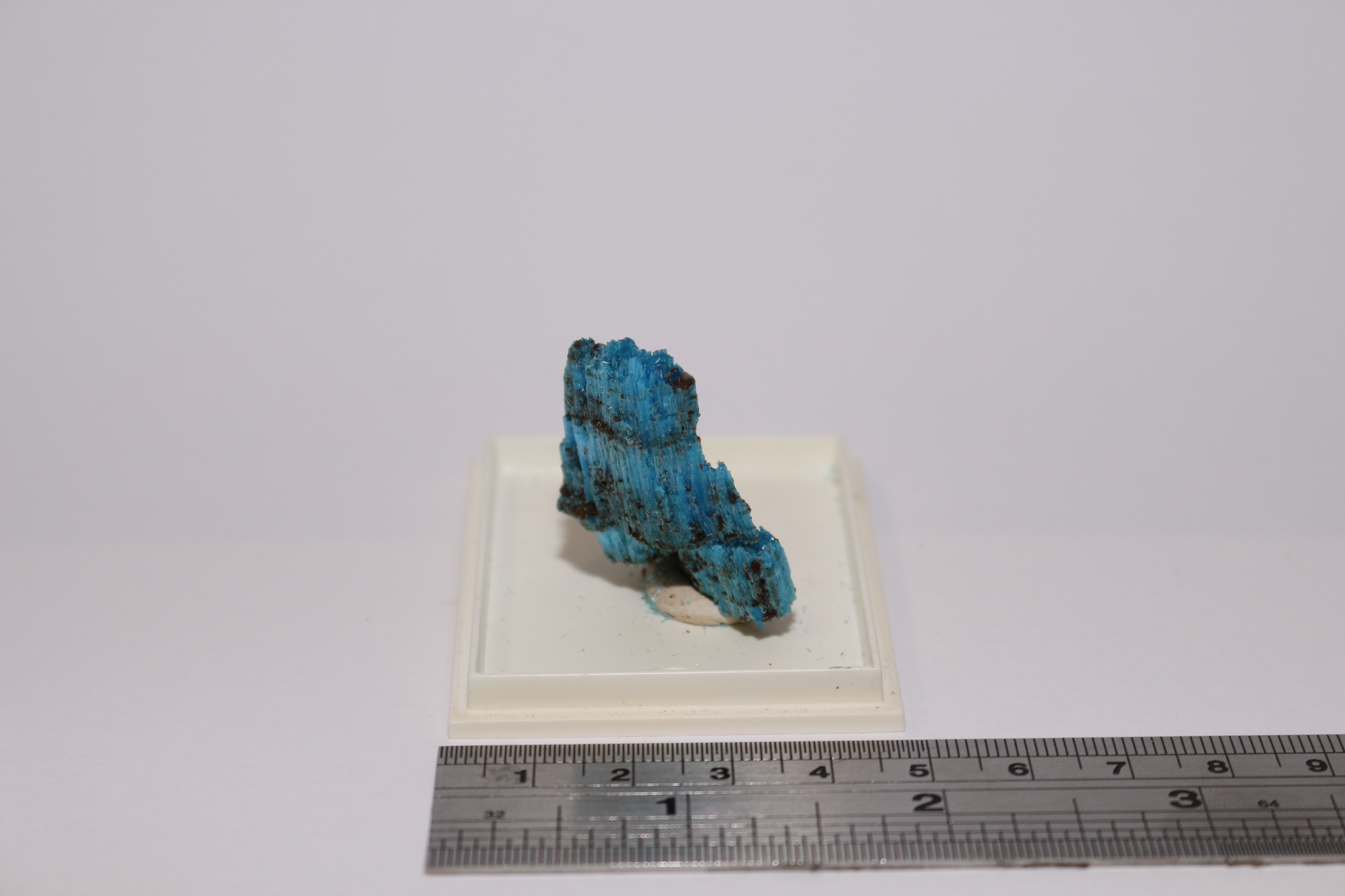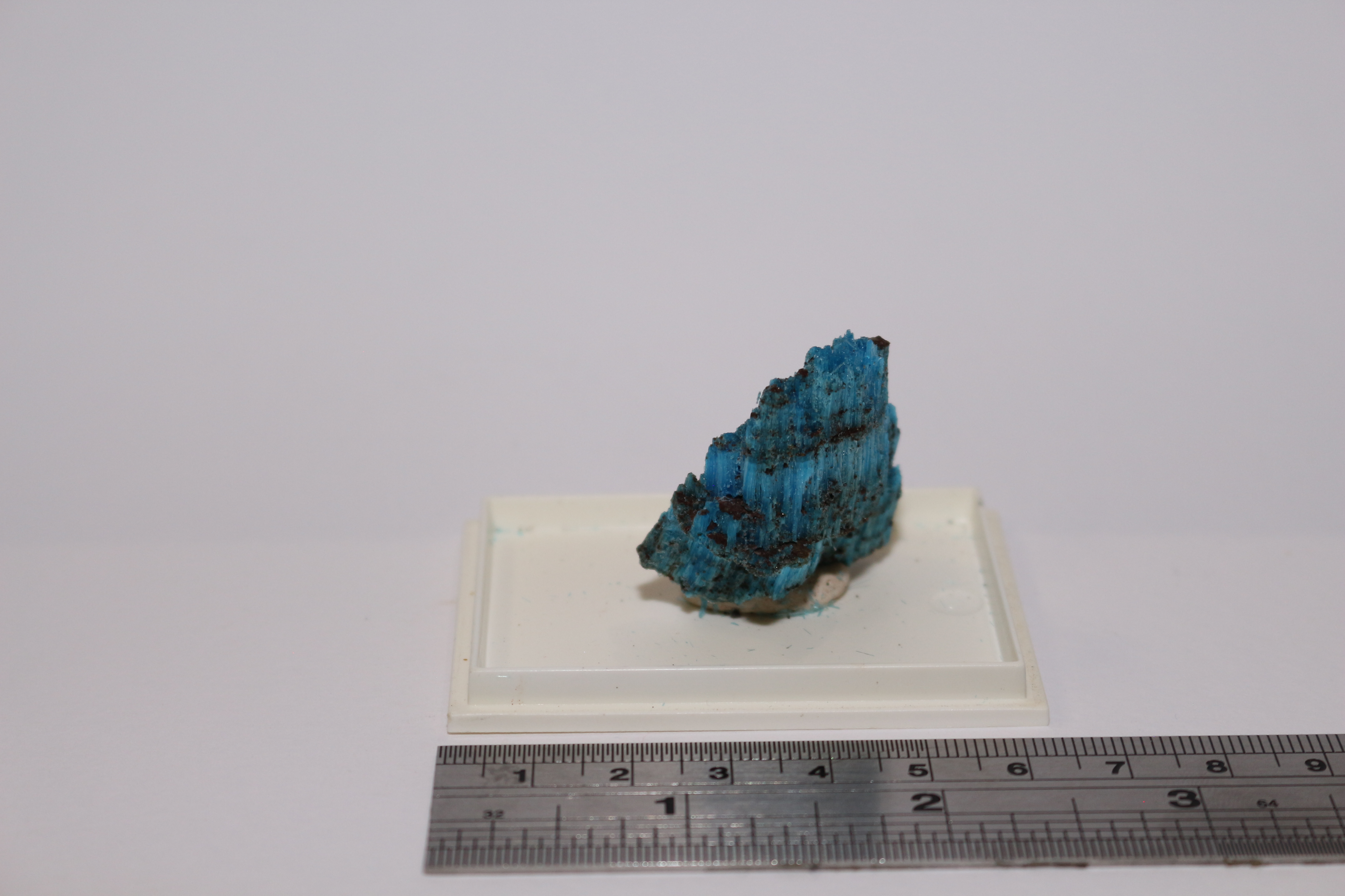 Specimen of Chalcanthite, blue fibrous crystals in layers. 4 x 3 cm.