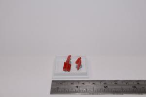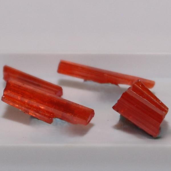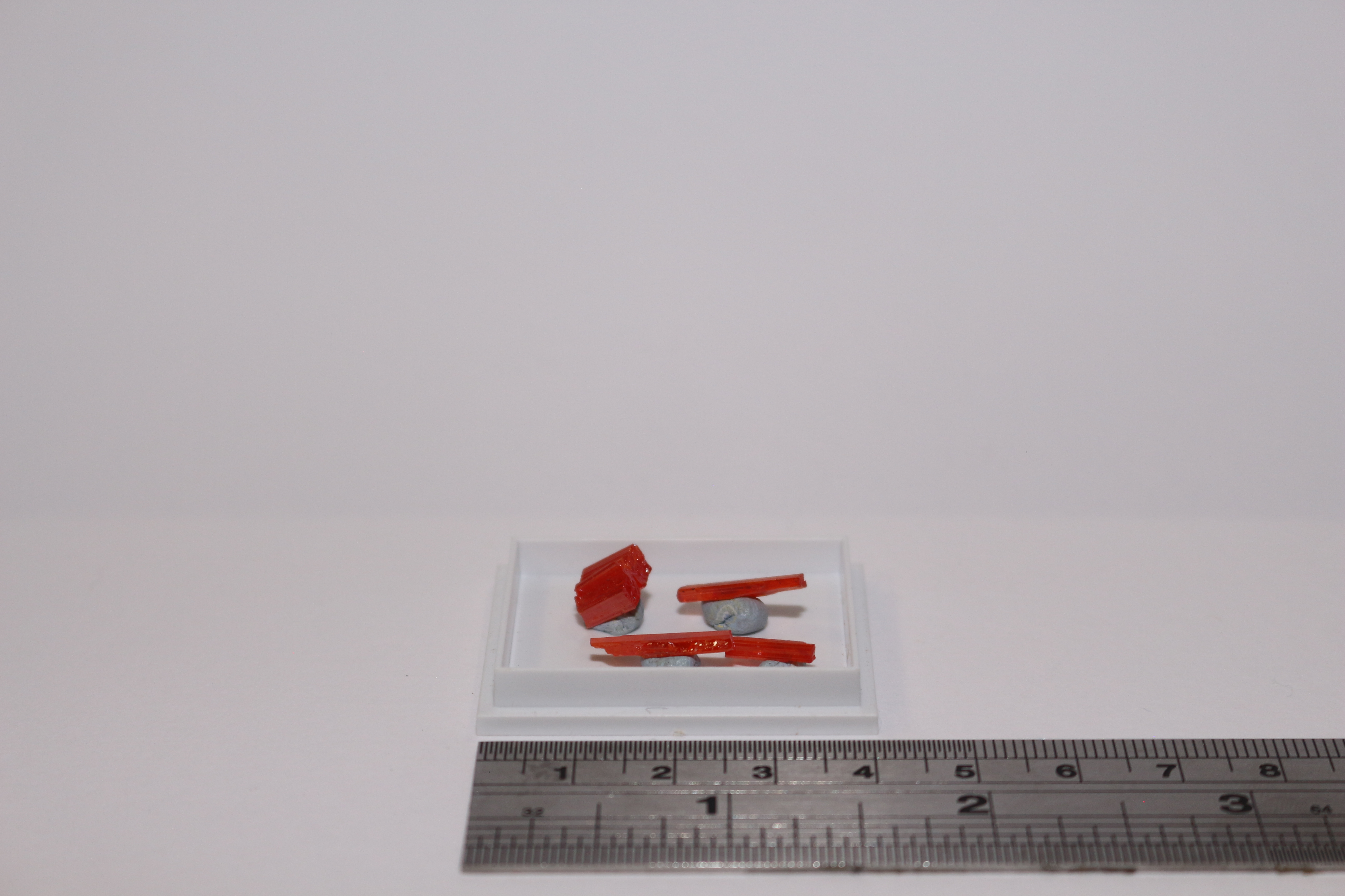 Description : 4 small lead chromate crystals, bright orange, each 1cm big. Bought at Sussex Mineral Show 2023