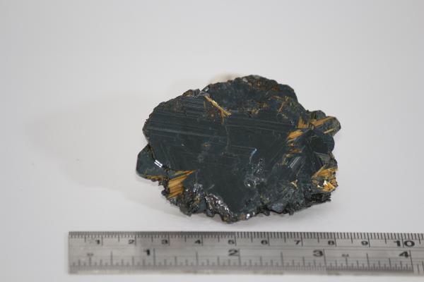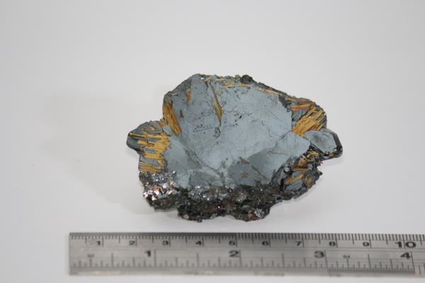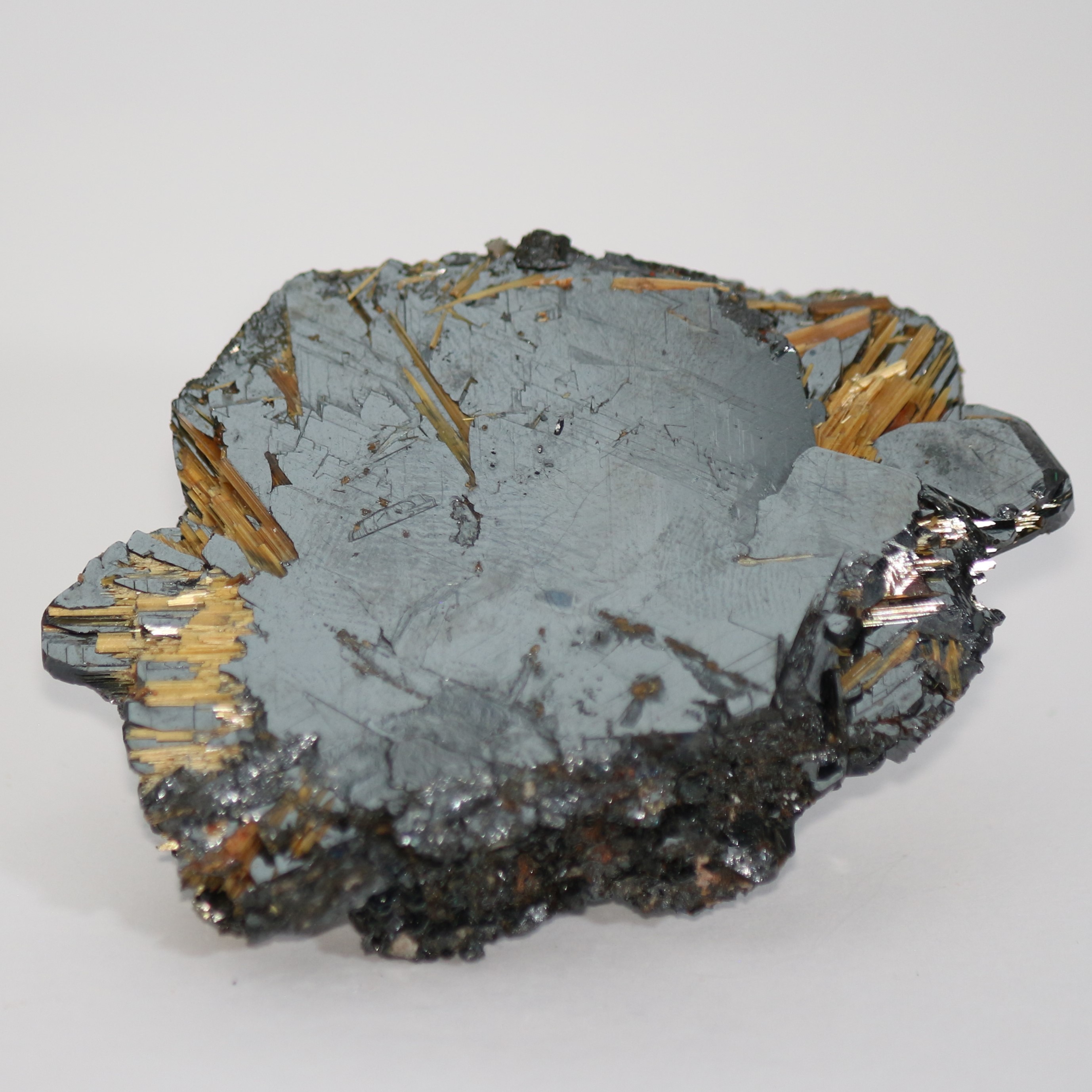 Golden yellow needles of rutile radiating outwards form centre of haematite platy crystals. 7x5x1cm Bought at Kempton Park in 2023