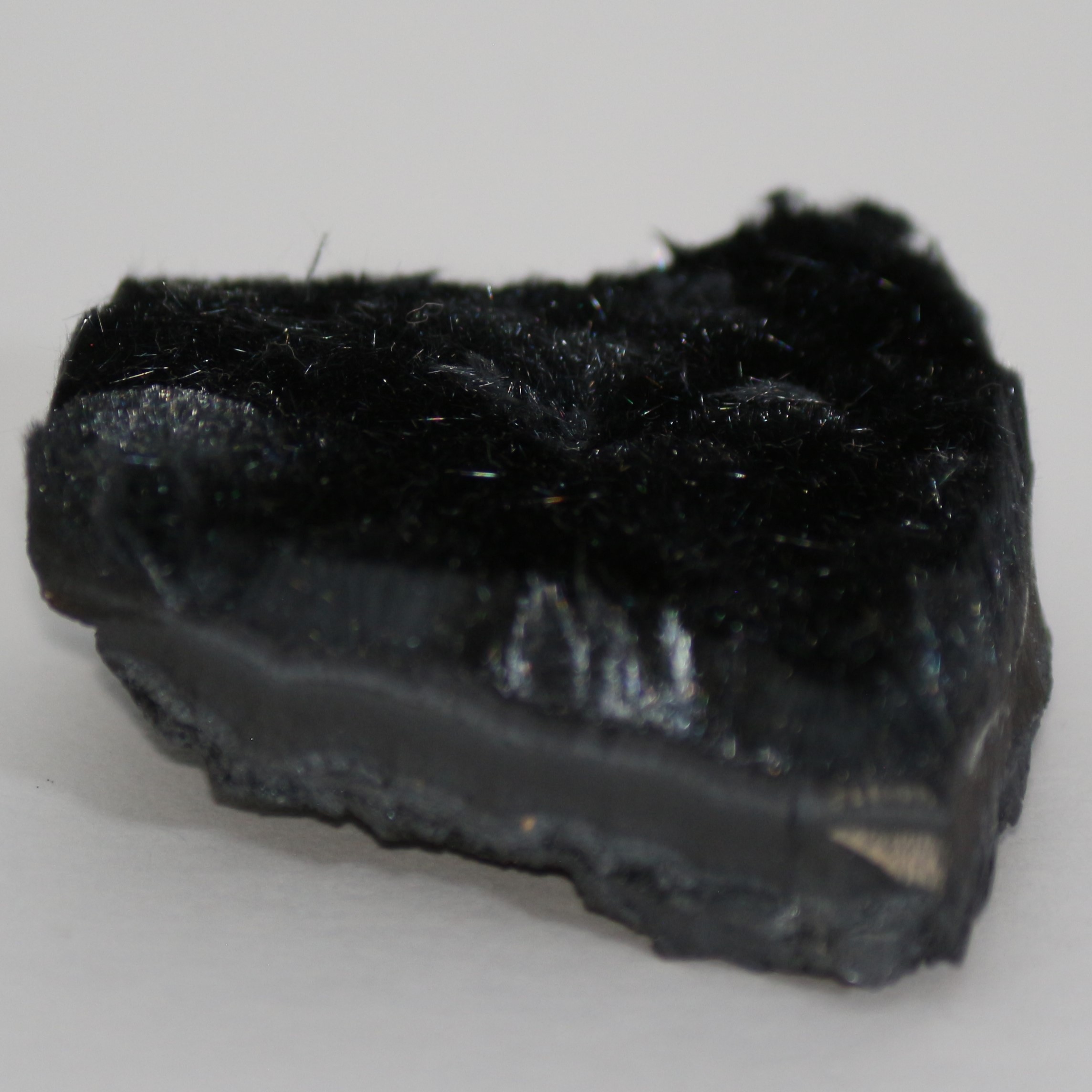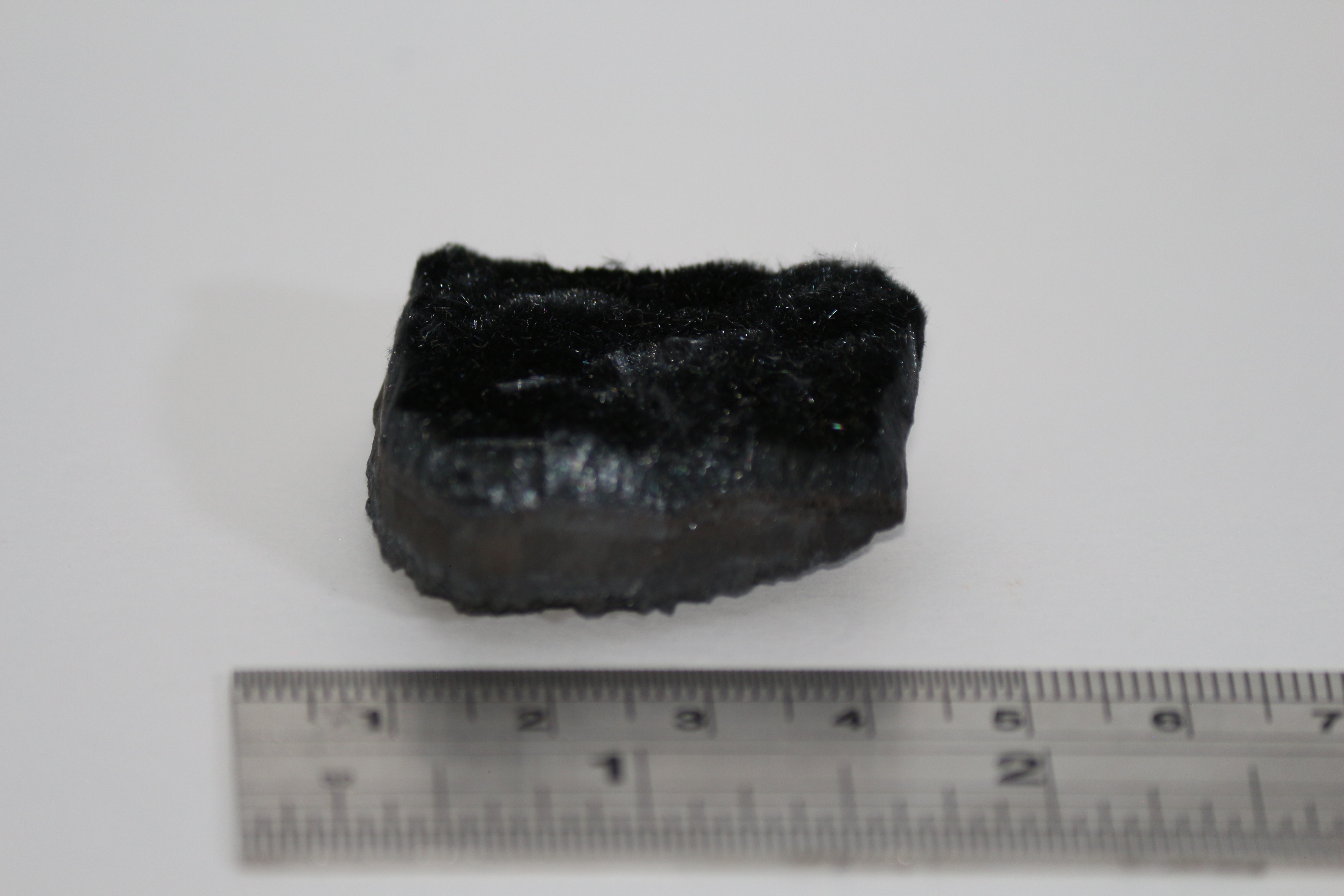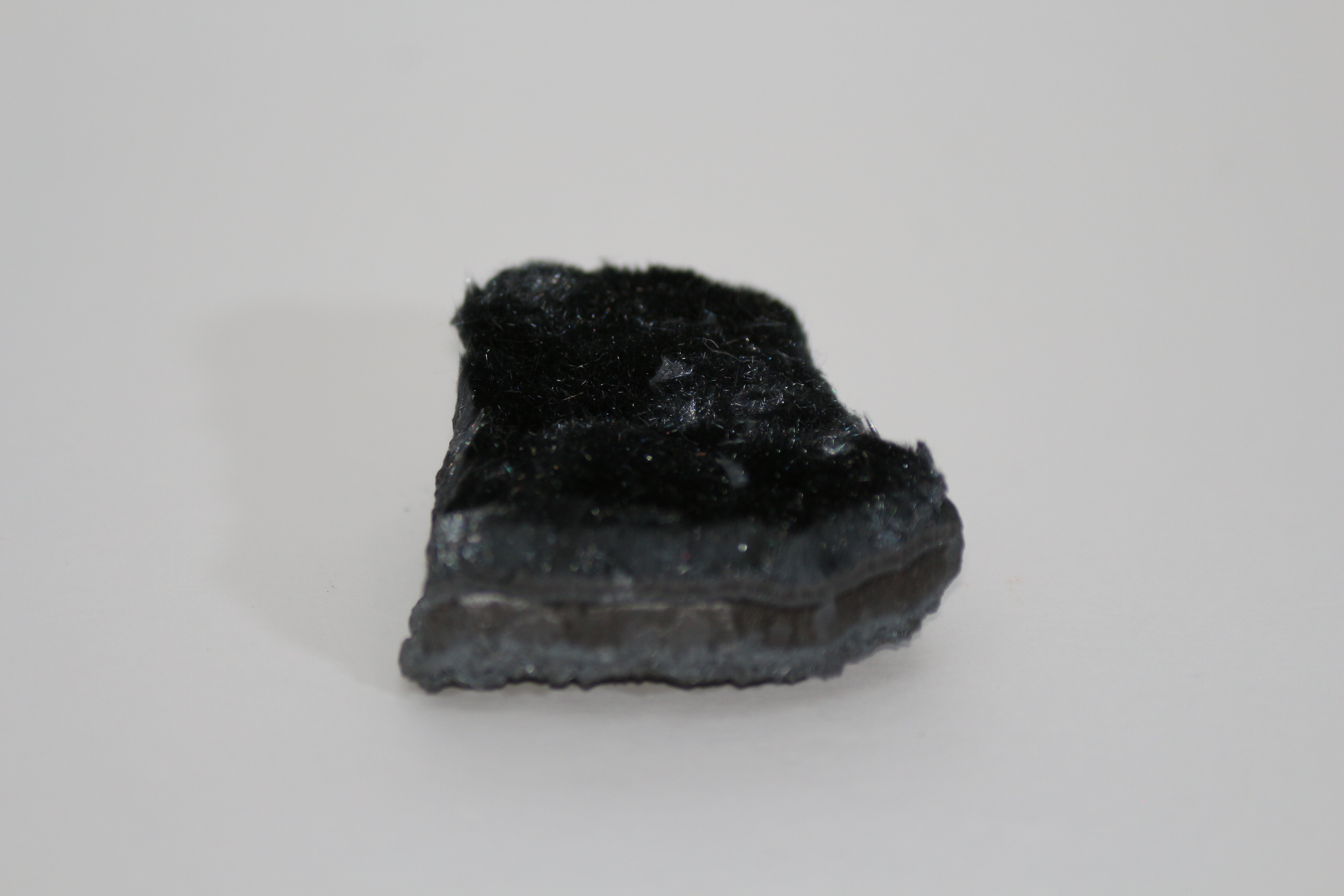 Very delicate furry crystalline mass of fine, fibrous, velvety Psilomelane growing on hard surface. 4x4x1.5cm. Black colour. Bought at Sussex mineral show in 2023
