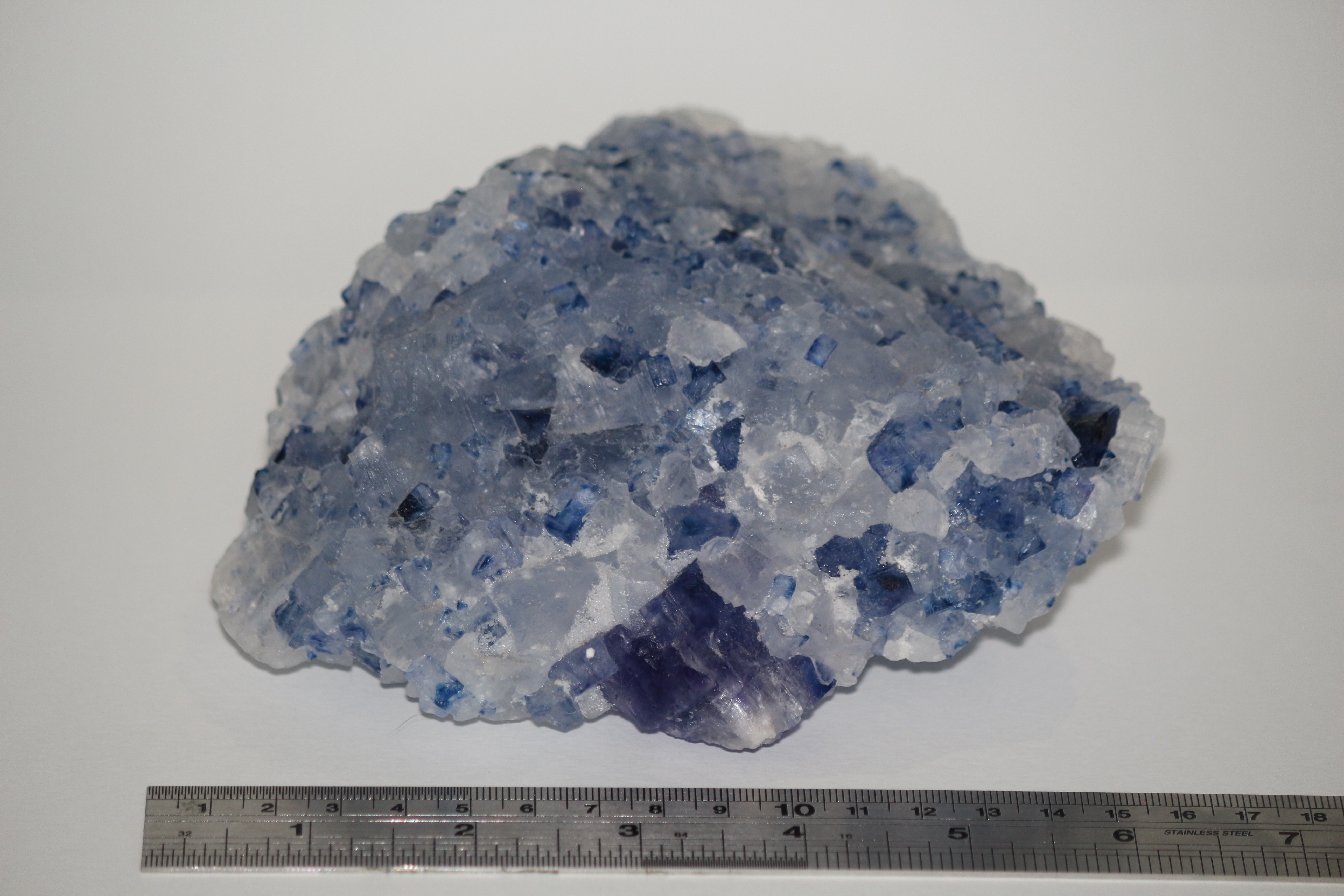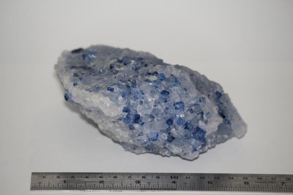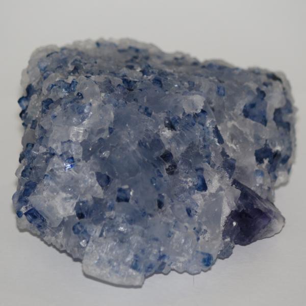 Cluster of irradiated halite crystals, dark blue. Range of intensity of colour to colourless. Specimen is 15x12x8cm. Donated by Imperial College in 2009