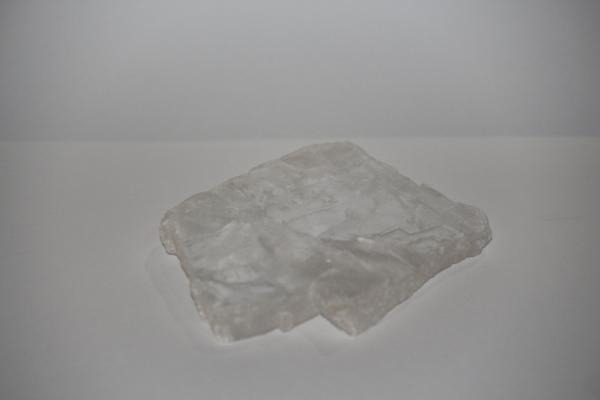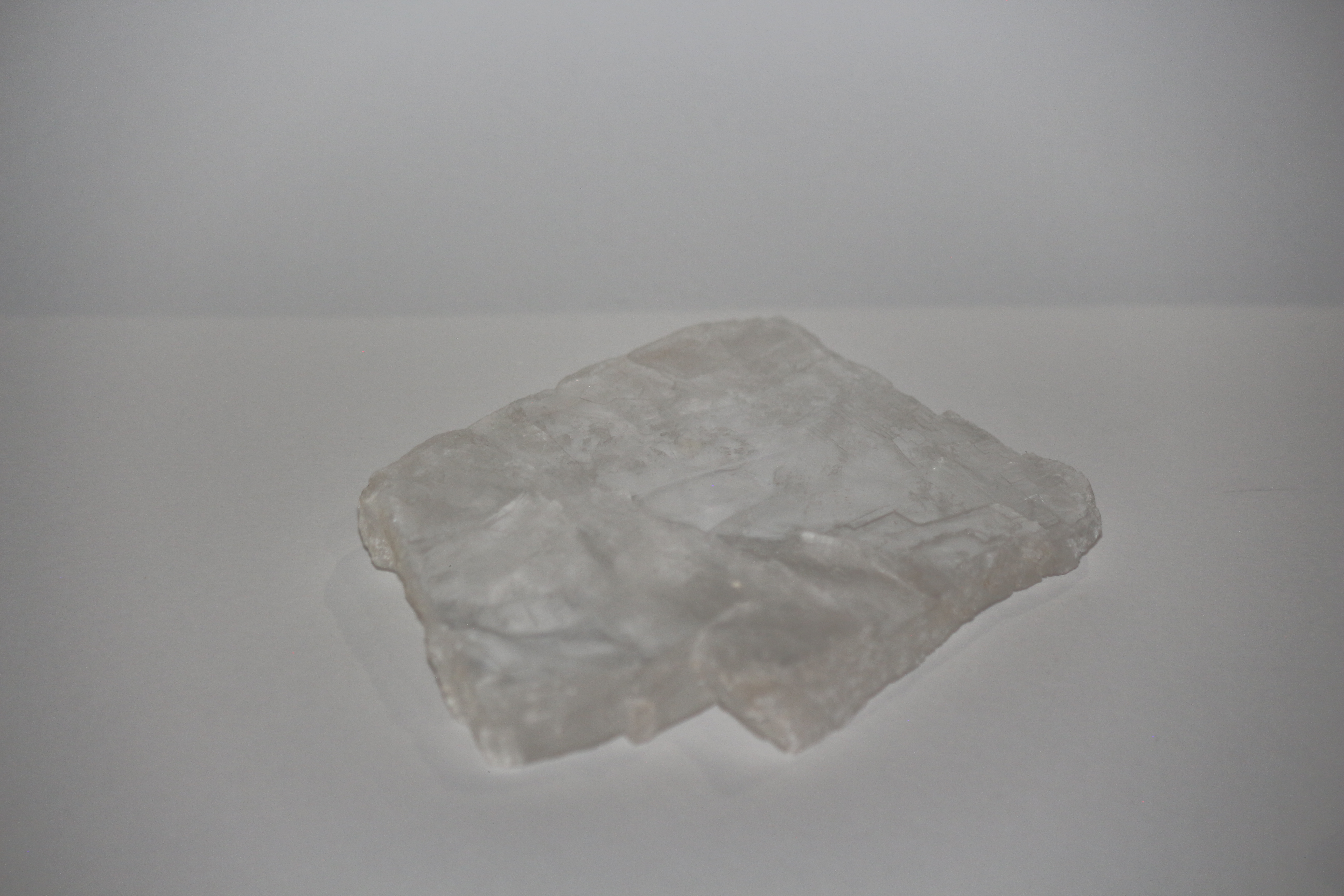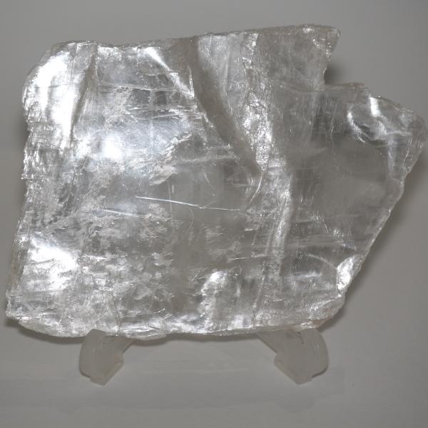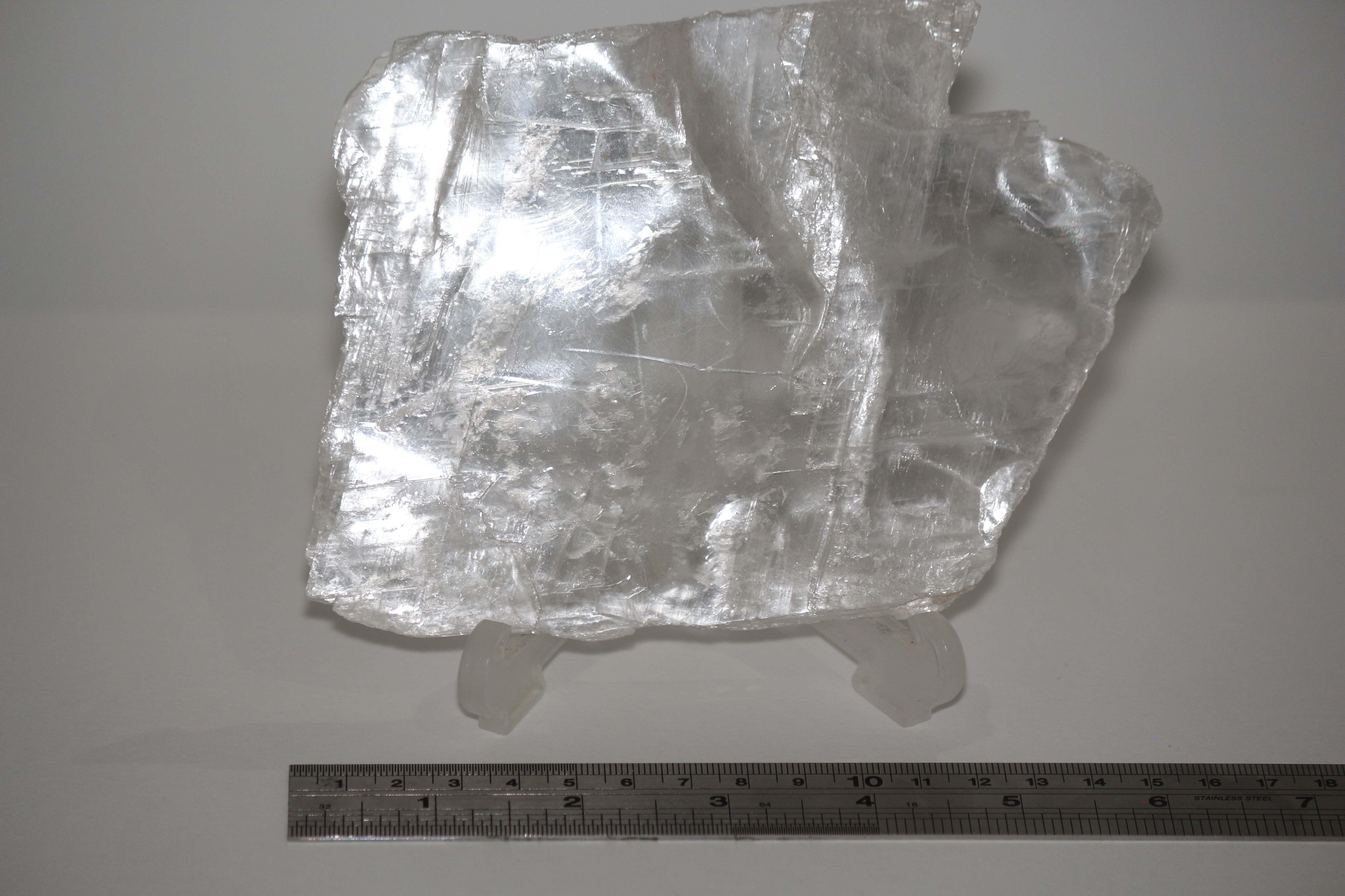 Large slice of gypsum crystal, 12x11x1.5cm. Beautiful clarity of crystal, cleavage planes visible in colourless crystal. Donated by Imperial College in 2009