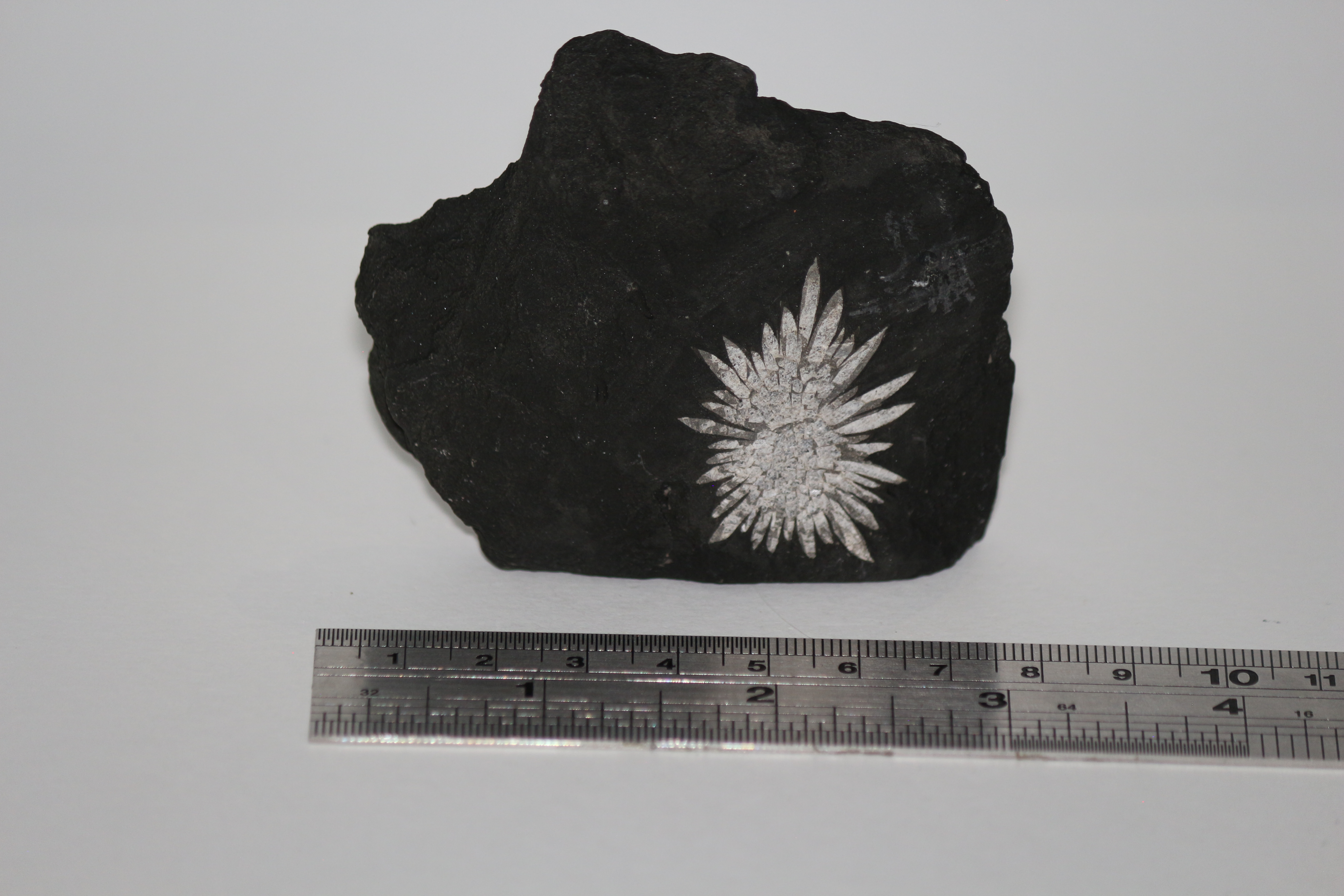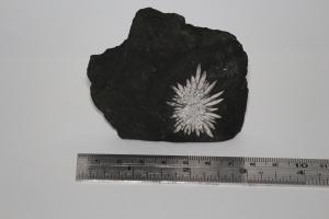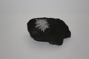 Description : Radiating white crystals on black country rock. Mixture of calcite, Chalcedony and minor dolomite replacing earlier Celestite. Radiating crystals 2-3cm in length. Bought at Sussex Mineral Show in 2024